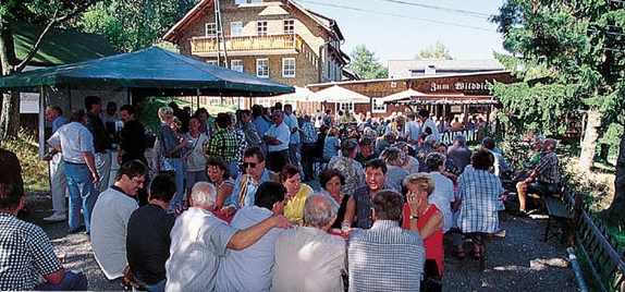 Leider hatte wir vergessen, uns rechtzeitig um Tickets für den Abgang mit der Seilbahn zu besorgen. Auch das sehr sehr großzügige Angebot eines Gastes, ihm die Karte doch zu einem Freundschaftspreis von 6,50€ statt 4,50€ abzukaufen, hat uns einen schnellen Abgang nicht ermöglicht (wir sind nun mal kniepig). Dennoch gelang es uns noch vor Dämmerungsbeginn mit dem steilen Abstieg zu beginnen. Erleichterung kam auf, als auch der Kartenbesitzer uns zu Fuß in angenehmer Weise begleitete. Der Weg führte uns durch wunderschöne Landschaftsbereiche des Sauerlands hinab zum Wilddieb. Dort wartete schon ein frisch gezapftes Bier auf uns, und noch eins und noch eins...